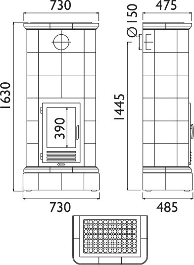 Печь Каледония имеет вытянутый корпус и облицована керамической плиткой двух цветов. Высокая эффективность чугунной топки поддержана технологией "двойного дожига", при которой каминное топливо сжигается практически без остатка. В качестве топлива используются сухие дрова длиной до 340 мм.